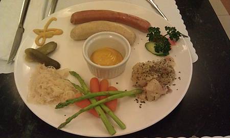 有酸黃瓜 德國酸菜(大推) 胡蘿蔔 蘆筍 馬鈴薯 (推) 一碟黃芥末 以及主角 起司豬肉香腸 (紅色) 小牛腸 (?? 抱歉 時間久遠 忘記了)