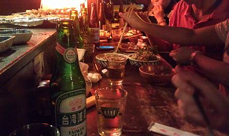 我我的角度可以看到廚師很認真的在烤東西以及大家桌上都擺了一瓶酒 (廢話 來居酒屋不喝酒嗎)