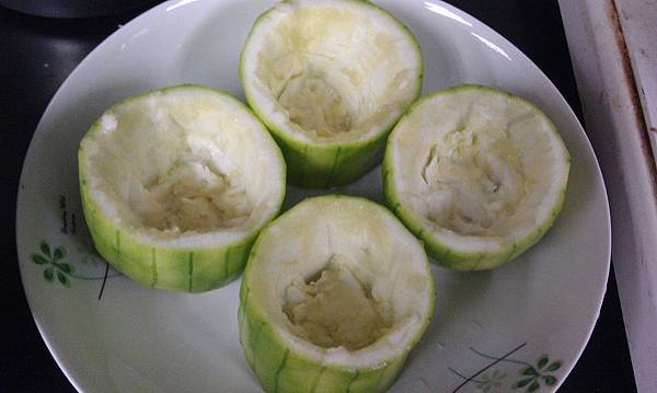 2. 將內部的囊取出, 只留一些作為底部. 把囊的部分切碎